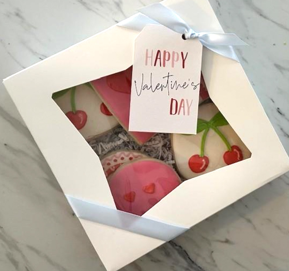 This set includes a mix of 12 decorated cookies packaged in a gift box with ribbon and tag